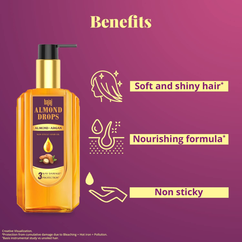 • Bajaj Almond Drops Almond + Argan oil protects the hair against cumulative damage from Chemical treatments, Heat styling and Pollution