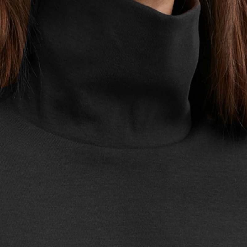 تي شيرت أسود صلب ، له ياقة سلحفاة ، وأكمام طويلة.