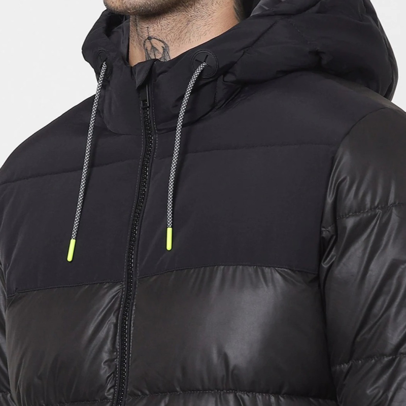 Black colour blocked padded jacket with zip detail, has a hooded, 2 pockets ,has a zip closure, long sleeves, straight hemline and polyester lining