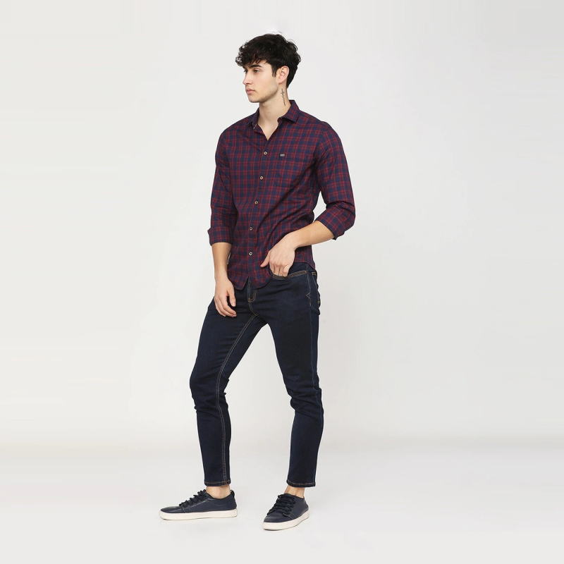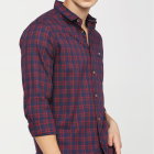 • Maroon and Navy Blue checked casual shirt, has a spread collar, long sleeves, button placket, curved hem, and 1 patch pocket.
