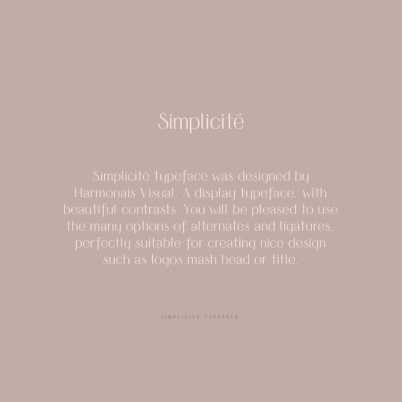 Simplicité typeface was designed by Harmonais Visual. A display typeface, with beautiful contrasts. You will be pleased to use the many options of alternates and ligatures, perfectly suitable for creating nice designs such as logos, mash heads, or titles.