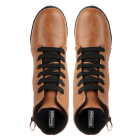 • A pair of black/Brown/tan/Grey round toe heeled boots, has high-top styling, lace-ups detail
